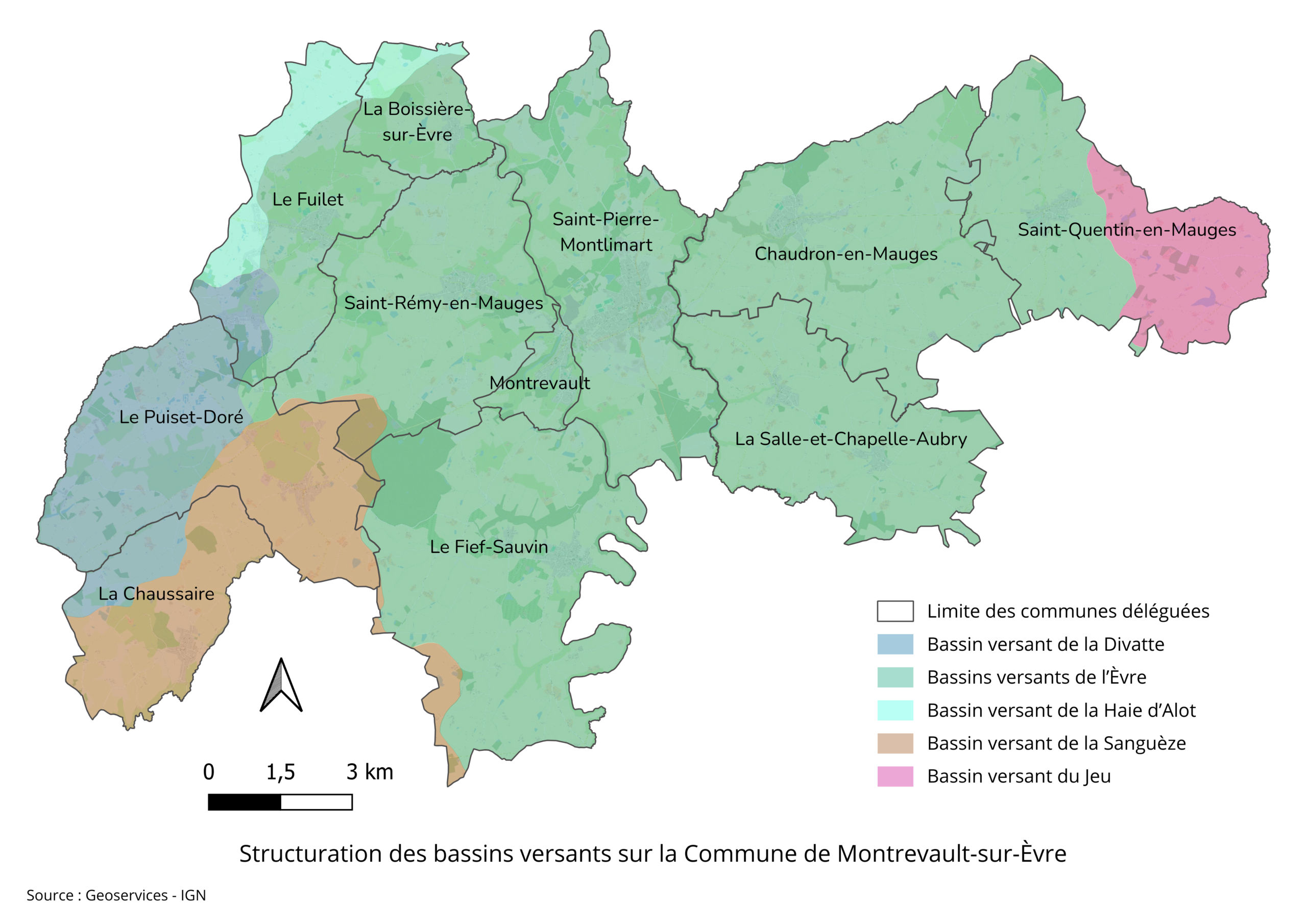 Les communes déléguées suivantes sont traversées par plusieurs bassins versants dont celui de l’Èvre :